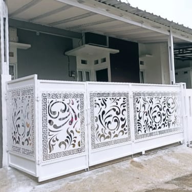 Pagar ini diproduksi menggunakan teknologi CNC (Computerized Numerical Control) laser cutting, menghasilkan pola yang sangat detail dan simetris.